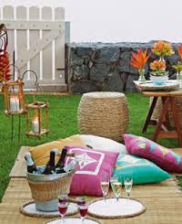Esteiras de palha com almofadas coloridas e redes são opções práticas e econômicas.